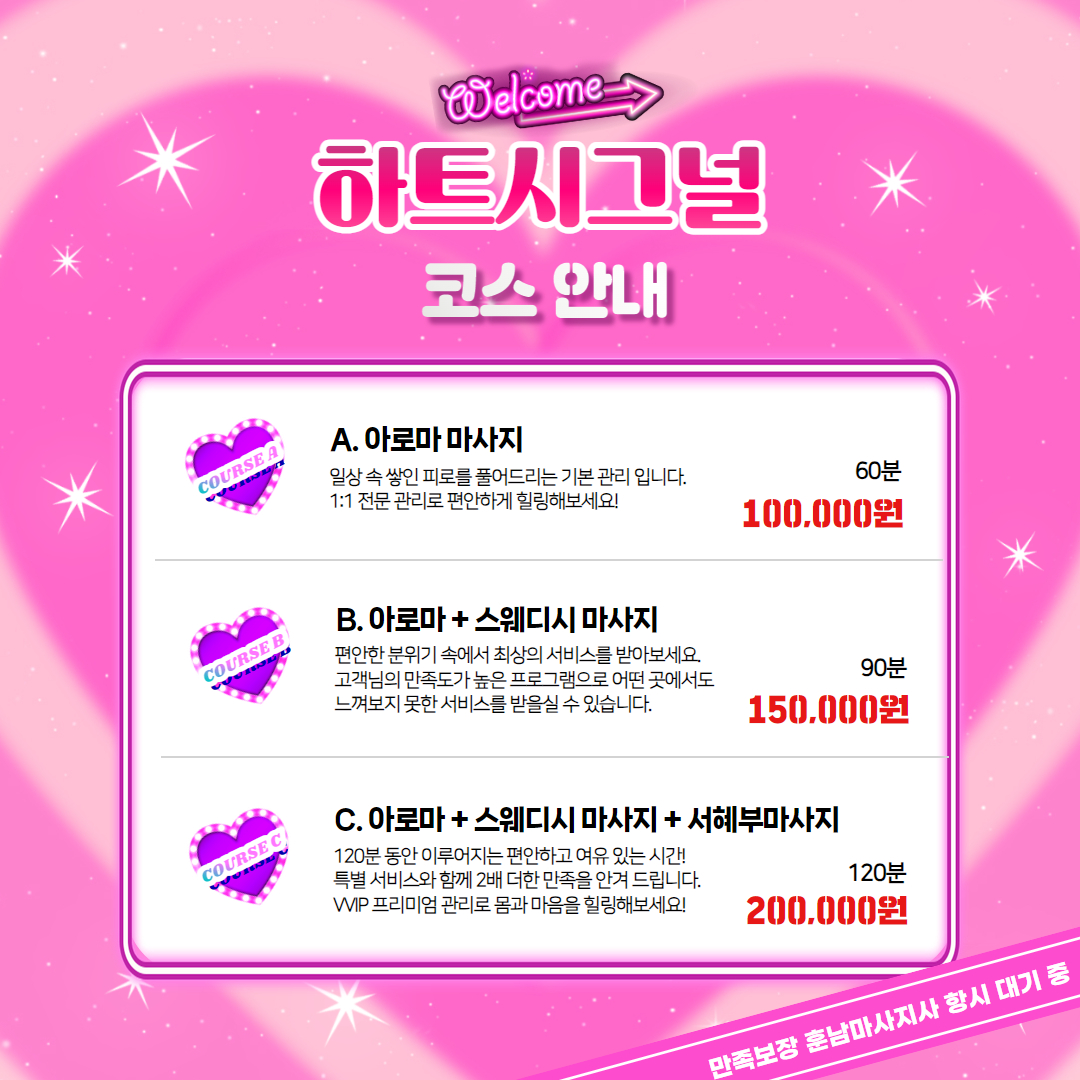 분당 토닥이가 특별한 컨셉을 가지고 있긴 하지만 그렇다고 가격적인 부당함을 느끼지 않도록 충분히 합리적이고 이벤트를 통해 보다 저렴한 가격을 만나보실 수 있습니다. 현재 기본적인 마사지 코스는 시간에 따라 60분, 90분, 120분으로 나뉘어 코스가 구성되어 있습니다. A 코스는 일상속 쌓인 피로를 풀어 드리는 기본 코스로서 아로마 테라피와 스웨디시 마사지를 60분동안 진행하게 되며 가격은 10만원입니다. B 코스는A 코스를 좀 더 길게 받고 싶은 분들이 선택하게 되시는데 90분으로 진행되며 금액은 15만원입니다. 120분동안 서비스 되는 C코스의 경우 서혜부마사지가 추가되며 기본코스에 비해 2배는 더 되는 만족도를 느낄 수 있을 것입니다. 만약 본인이 원하는 관리사를 지정하여 장기간 케어를 원하실 경우 별도 문의를 통해 가격협의를 할 수 있으며 고객센터를 통해 관리사를 지정 및 교체를 할 수 있습니다.